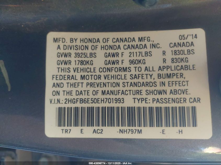 2014 HONDA CIVIC - 2HGFB6E50EH701993, колір - Сірий, 2.4, Бензин, Передній привід із США