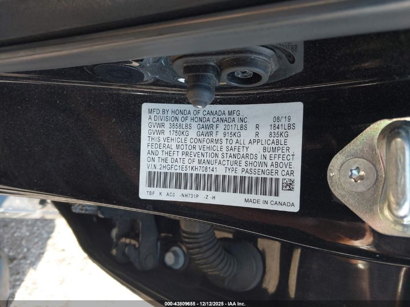 2019 HONDA CIVIC - 2HGFC1E51KH708141, колір - Чорний, 1.5, Бензин, Передній привід із США