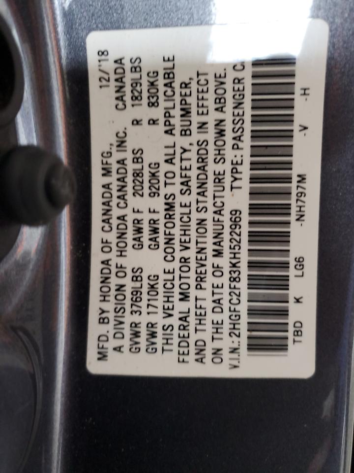 2019 HONDA CIVIC - 2HGFC2F83KH522969, колір - Сірий, 2.0, Бензин, із США