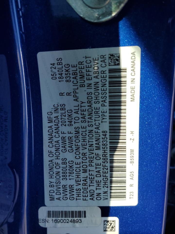 2024 HONDA CIVIC - 2HGFE2F56RH583548, колір - Синій, 2.0, Бензин, із США