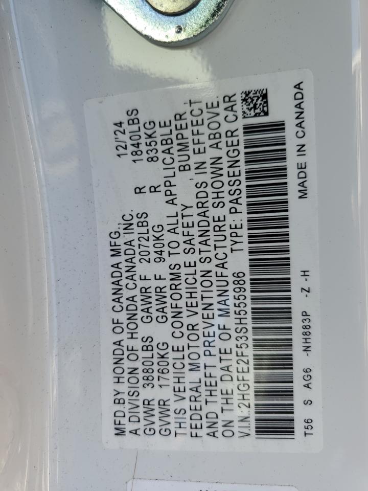 2025 HONDA CIVIC - 2HGFE2F53SH555986, колір - Білий, 2.0, Бензин, із США