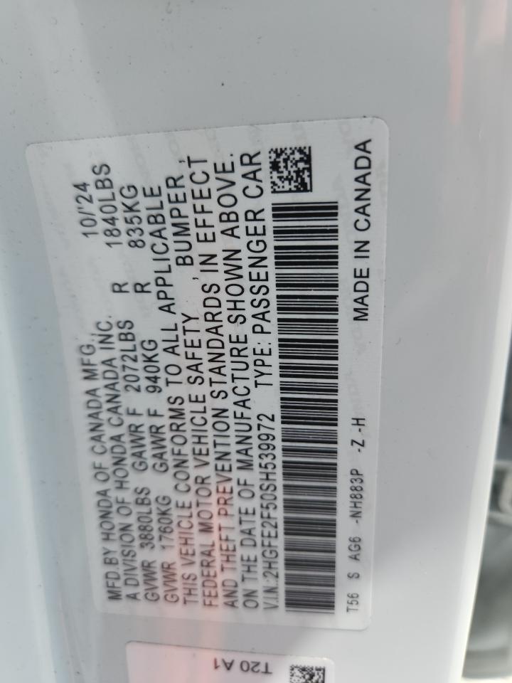 2025 HONDA CIVIC - 2HGFE2F50SH539972, колір - Білий, 2.0, Бензин, із США