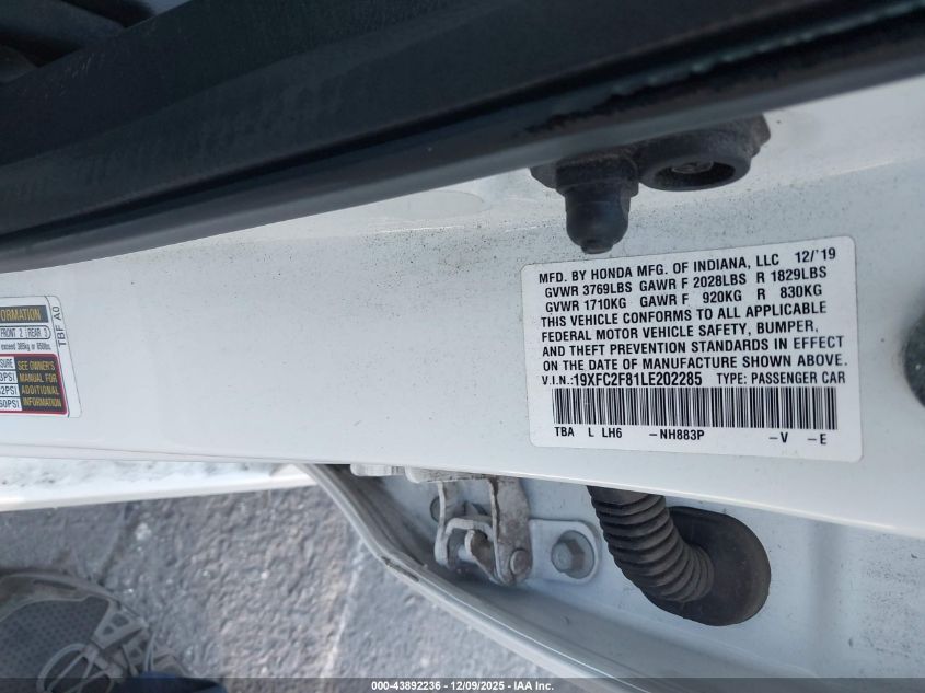 2020 HONDA CIVIC - 19XFC2F81LE202285, колір - Білий, 2.0, Бензин, Передній привід із США