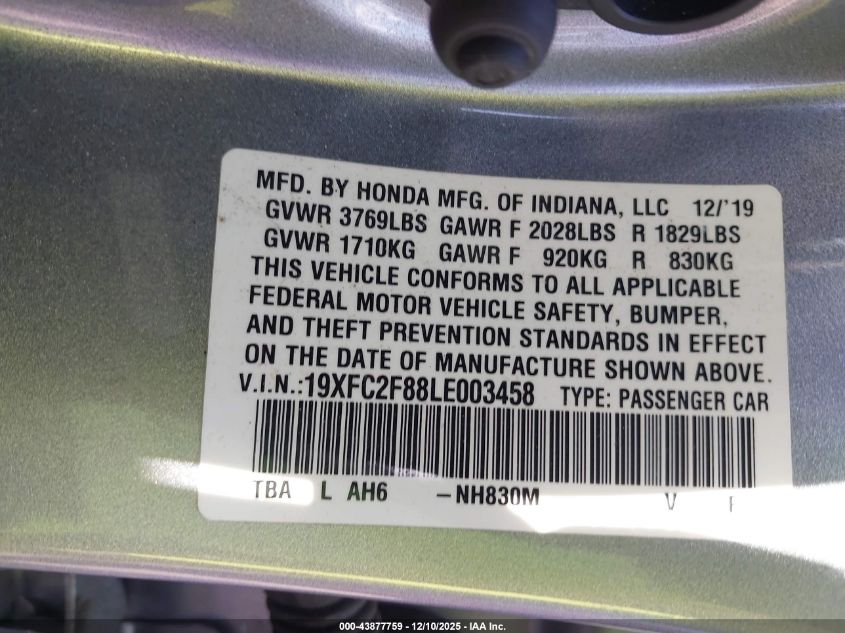 2020 HONDA CIVIC - 19XFC2F88LE003458, колір - Срібний, 2.0, Бензин, Передній привід із США