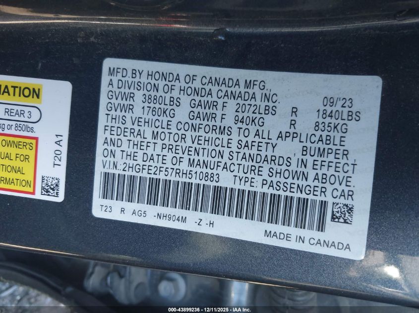 2024 HONDA CIVIC - 2HGFE2F57RH510883, колір - Сірий, 2.0, Бензин, Передній привід із США