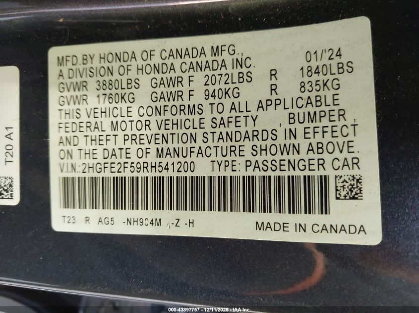2024 HONDA CIVIC - 2HGFE2F59RH541200, колір - Сірий, 2.0, Бензин, Передній привід із США