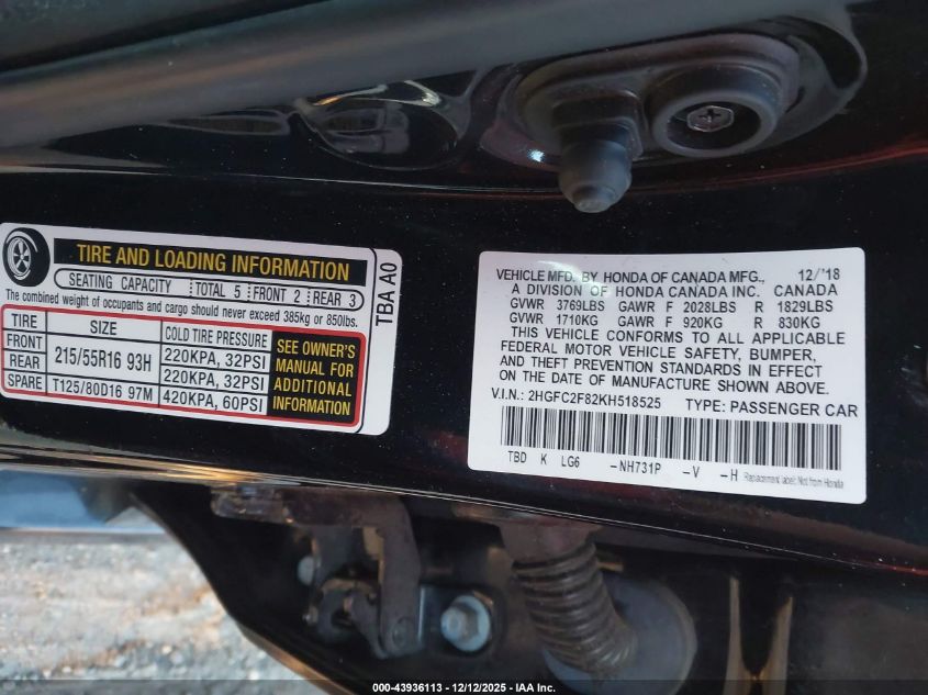 2019 HONDA CIVIC - 2HGFC2F82KH518525, колір - Чорний, 2.0, Бензин, Передній привід із США