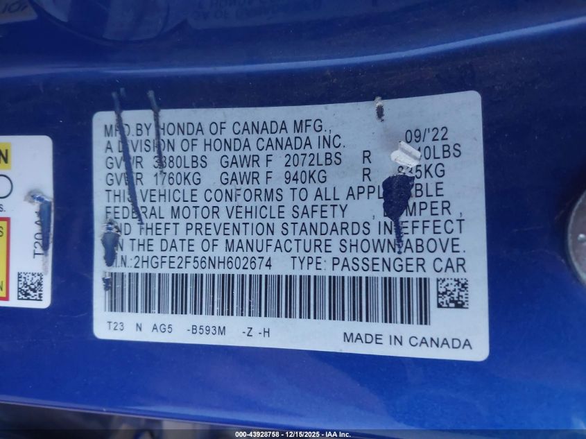 2022 HONDA CIVIC - 2HGFE2F56NH602674, колір - Синій, 2.0, Бензин, Передній привід із США