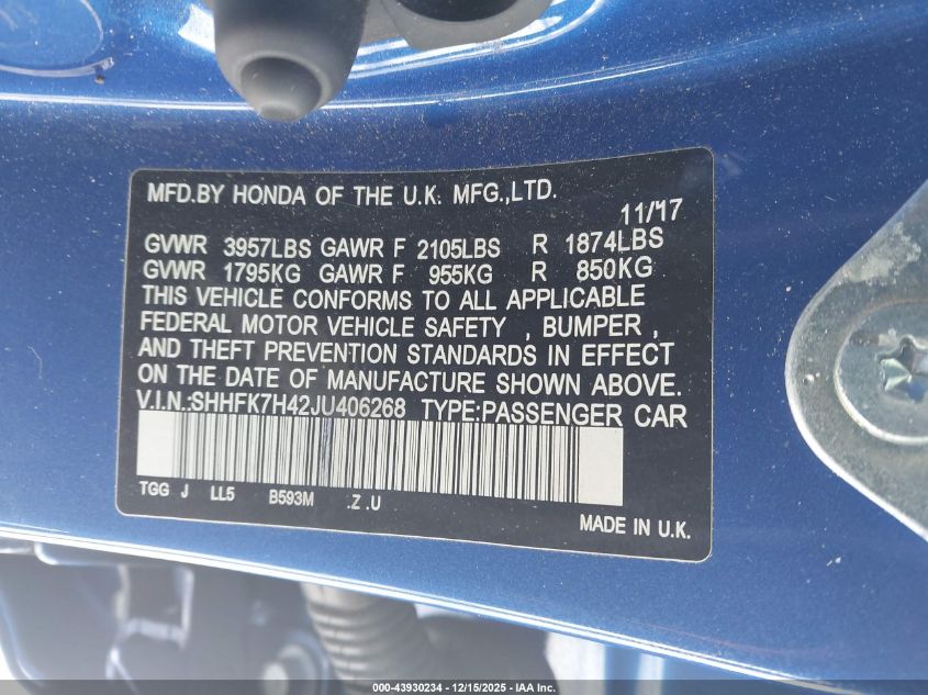 2018 HONDA CIVIC - SHHFK7H42JU406268, колір - Синій, 1.5, Бензин, Передній привід із США