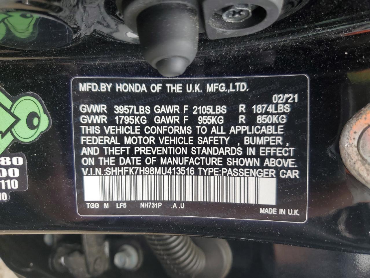 2021 HONDA CIVIC - SHHFK7H98MU413516, колір - Чорний, 1.5, Бензин, із США