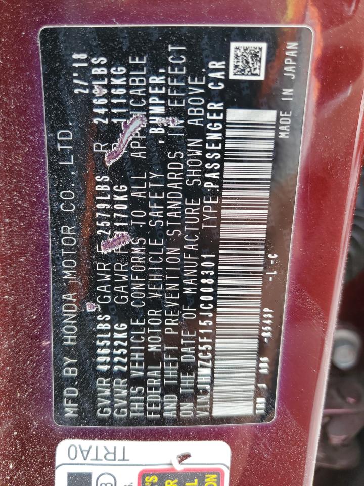 2018 HONDA CLARITY - JHMZC5F15JC008301, колір - Бургундія, 1.5, Гібрид, із США