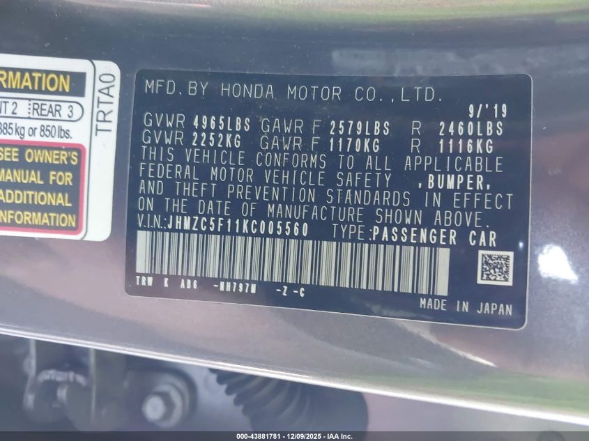 2019 HONDA CLARITY - JHMZC5F11KC005560, колір - Сірий, 1.5, Гібрид, Передній привід із США
