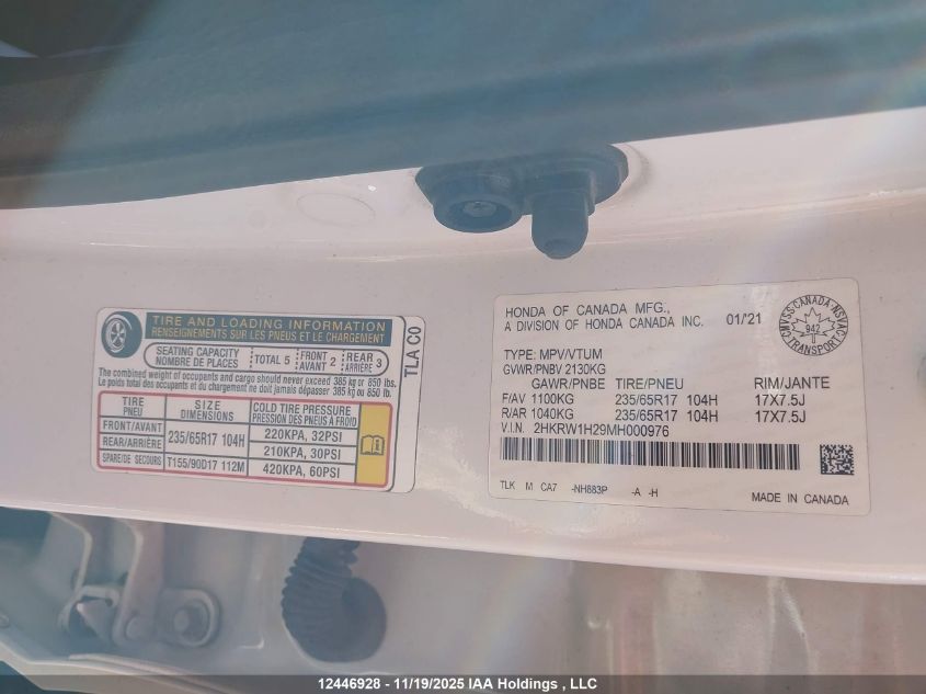 2021 HONDA CR-V - 2HKRW1H29MH000976, колір - Білий, , Бензин, Передній привід із США
