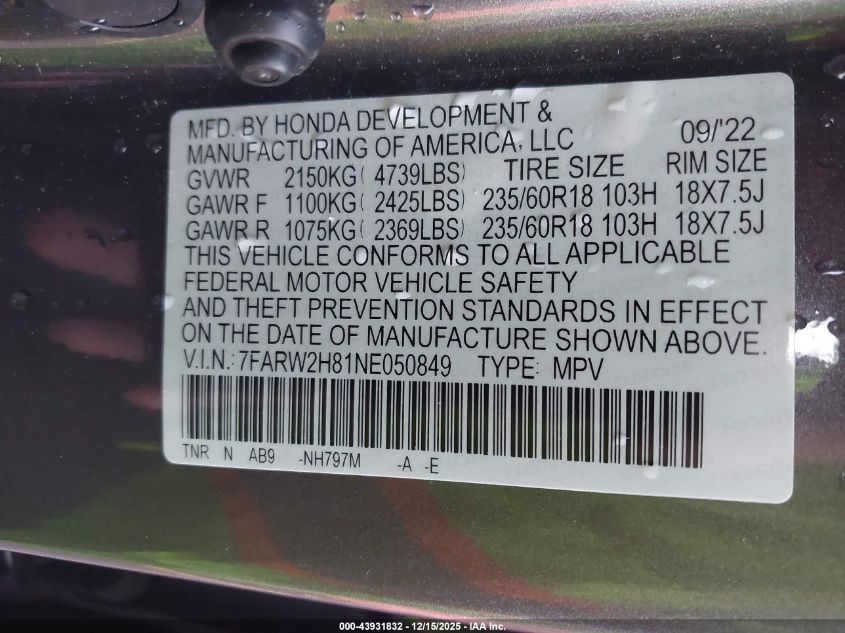 2022 HONDA CR-V - 7FARW2H81NE050849, колір - Сірий, 1.5, Бензин, Повний привід із США