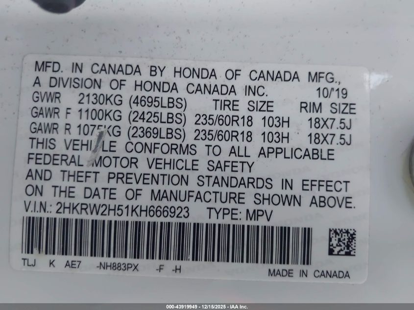 2019 HONDA CR-V - 2HKRW2H51KH666923, колір - Білий, 1.5, Бензин, Повний привід із США