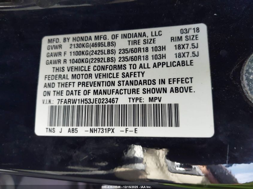 2018 HONDA CR-V - 7FARW1H53JE023467, колір - Чорний, 1.5, Бензин, Передній привід із США