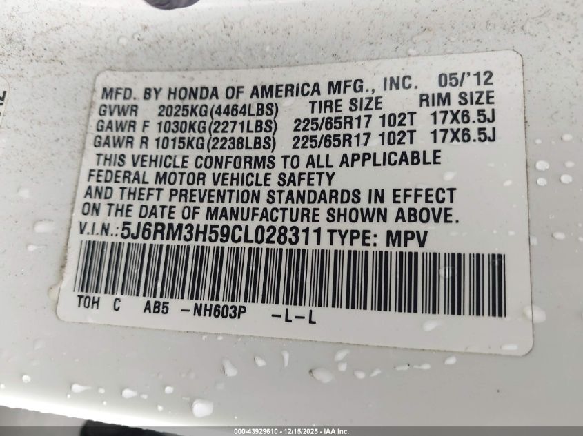 2012 HONDA CR-V - 5J6RM3H59CL028311, колір - Білий, 2.4, Бензин, Передній привід із США