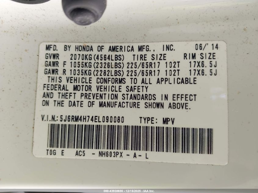 Колір БілийЦиліндри 4Привід Повний привідVIN 5J6RM4H74EL090080Стан Заводиться та їде (перевірено)Ушкодження Передня або задня