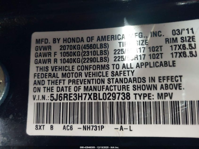 2011 HONDA CR-V - 5J6RE3H7XBL029738, колір - , 2.4, Бензин, Передній привід із США