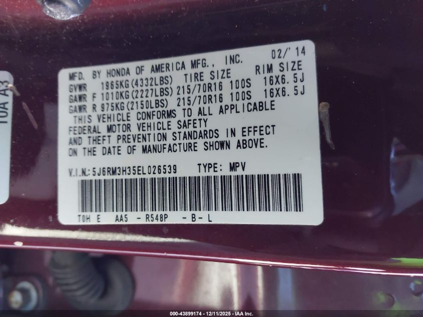 2014 HONDA CR-V - 5J6RM3H35EL026539, колір - Бургундія, 2.4, Бензин, Передній привід із США