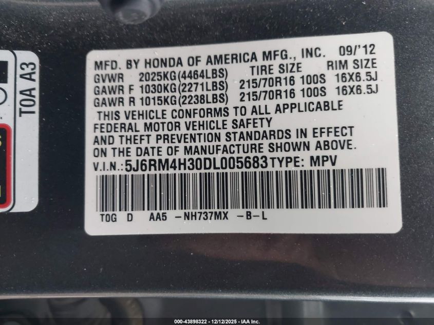 Колір СірийЦиліндри 4Привід Повний привідVIN 5J6RM4H30DL005683Стан Заводиться та їде (перевірено)Ушкодження Передня або задня