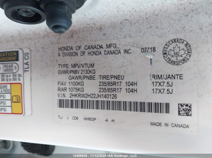 2018 HONDA CR-V - 2HKRW2H22JH140126, колір - Білий, , Бензин, Повний привід із США