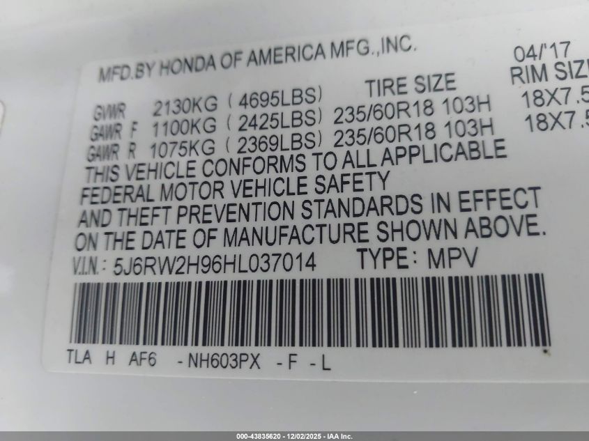 2017 HONDA CR-V - 5J6RW2H96HL037014, колір - Білий, 1.5, Бензин, Повний привід із США