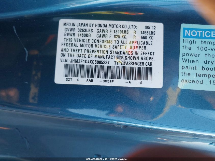 2012 HONDA CR-Z - JHMZF1D4XCS005237, колір - Бірюзовий, 1.5, Гібрид, Передній привід із США