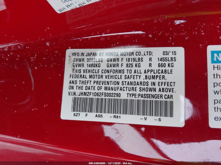 2015 HONDA CR-Z - JHMZF1D62FS002290, колір - Червоний, 1.5, Гібрид, Передній привід із США