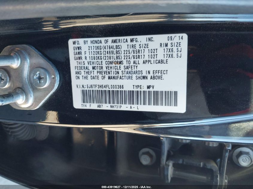 2015 HONDA CROSSTOUR - 5J6TF3H54FL000386, колір - Чорний, 2.4, Бензин, Передній привід із США