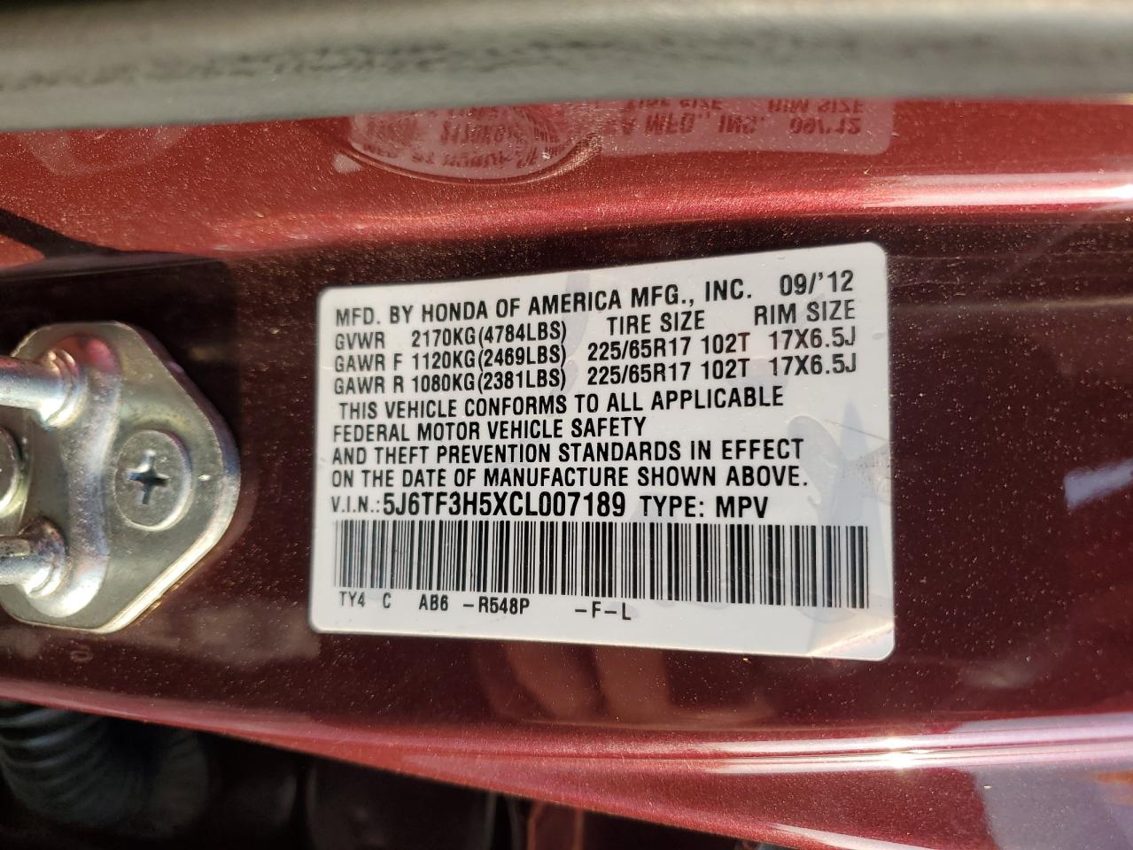 2012 HONDA CROSSTOUR - 5J6TF3H5XCL007189, колір - Бордовий, 2.4, Бензин, із США