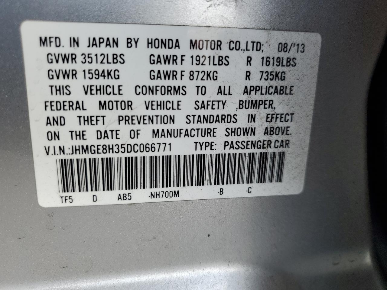 Колір СрібнийЦиліндри 4VIN JHMGE8H35DC066771Стан Заводиться та їде (перевірено)Ушкодження Передня або задняДата аукціона 2025-10-07