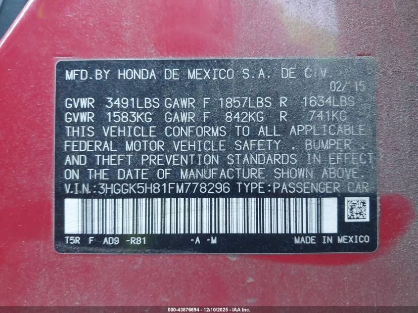 2015 HONDA FIT - 3HGGK5H81FM778296, колір - Червоний, 1.5, Бензин, Передній привід із США