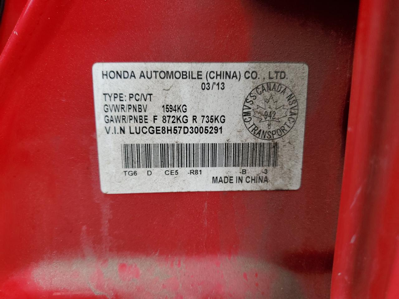 2013 HONDA FIT - LUCGE8H57D3005291, колір - Червоний, 1.5, Бензин, із США