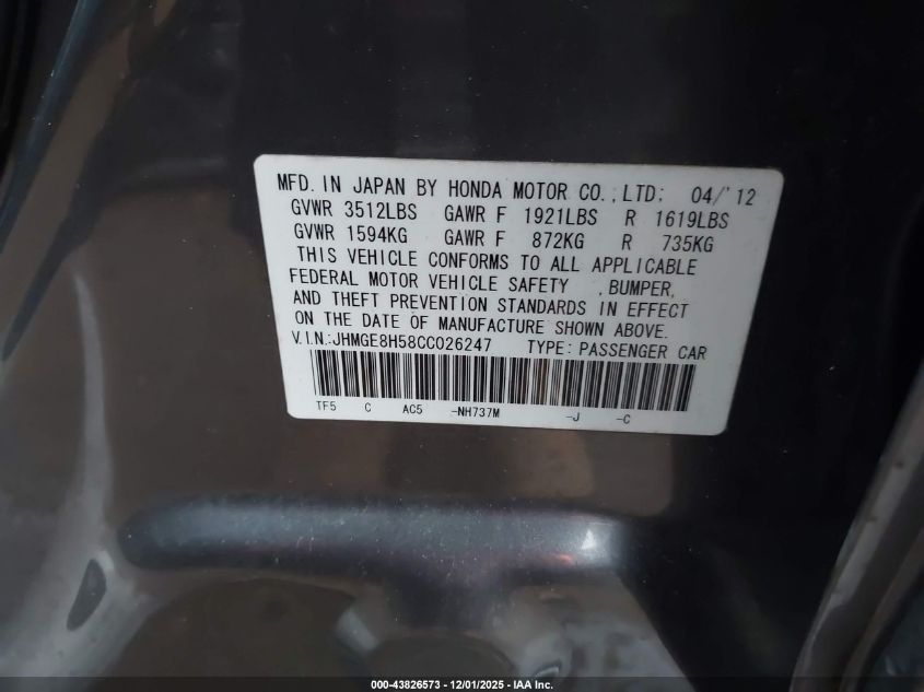 2012 HONDA FIT - JHMGE8H58CC026247, колір - Сірий, 1.5, Бензин, Передній привід із США