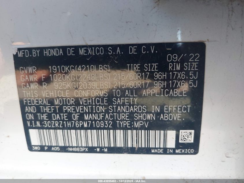 2023 HONDA HR-V - 3CZRZ1H76PM710932, колір - Білий, 2.0, Бензин, Передній привід із США
