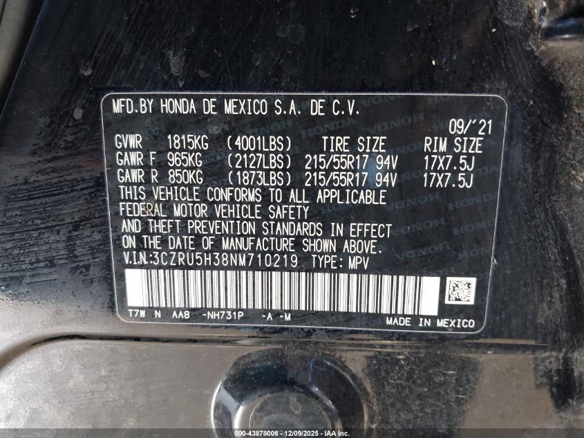 2022 HONDA HR-V - 3CZRU5H38NM710219, колір - Чорний, 1.8, Бензин, Передній привід із США