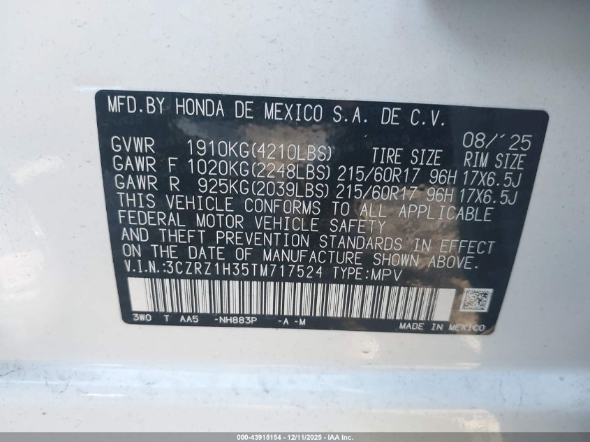 2026 HONDA HR-V - 3CZRZ1H35TM717524, колір - Білий, 2.0, Бензин, Передній привід із США