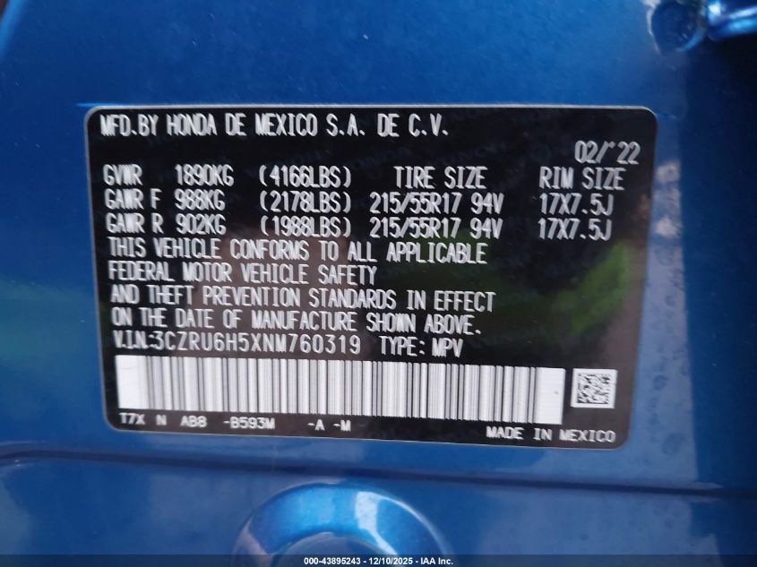 2022 HONDA HR-V - 3CZRU6H5XNM760319, колір - Синій, 1.8, Бензин, Повний привід із США
