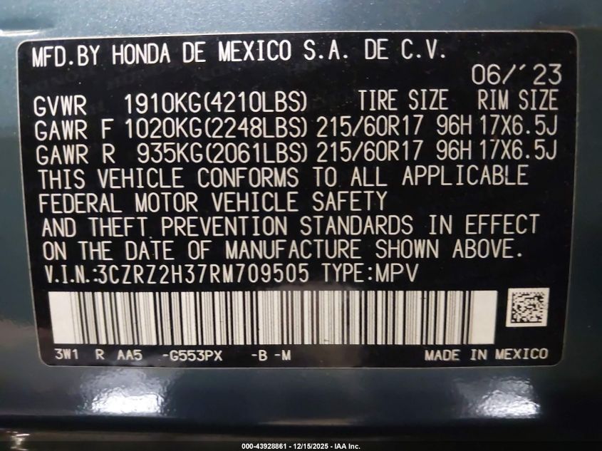 2024 HONDA HR-V - 3CZRZ2H37RM709505, колір - Синій, 2.0, Бензин, Повний привід із США