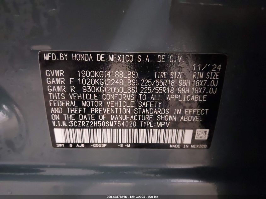 2025 HONDA HR-V - 3CZRZ2H50SM754020, колір - Сірий, 2.0, Бензин, Повний привід із США
