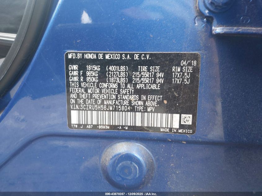 2018 HONDA HR-V - 3CZRU5H56JM715804, колір - Синій, 1.8, Бензин, Передній привід із США