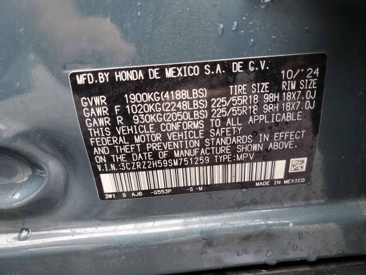 2025 HONDA HR-V - 3CZRZ2H59SM751259, колір - Синій, 2.0, Бензин, Повний привід із США