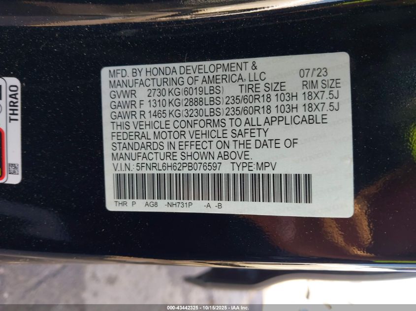 2023 HONDA ODYSSEY - 5FNRL6H62PB076597, колір - Чорний, 3.5, Бензин, Передній привід із США