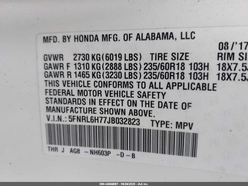 2018 HONDA ODYSSEY - 5FNRL6H77JB032823, колір - Білий, 3.5, Бензин, Передній привід із США
