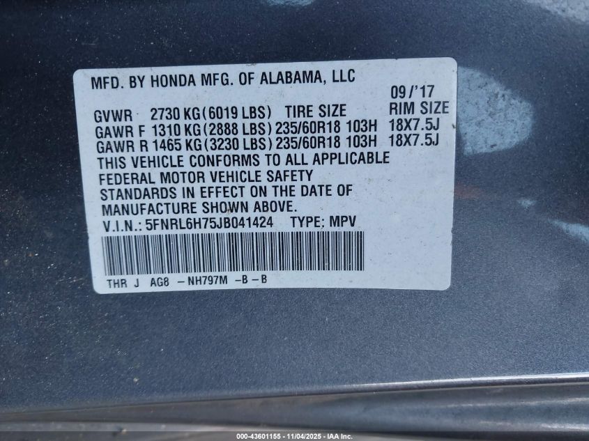 Колір СірийЦиліндри 6Привід Передній привідVIN 5FNRL6H75JB041424Стан Заводиться та їде (перевірено)Ушкодження Передня права