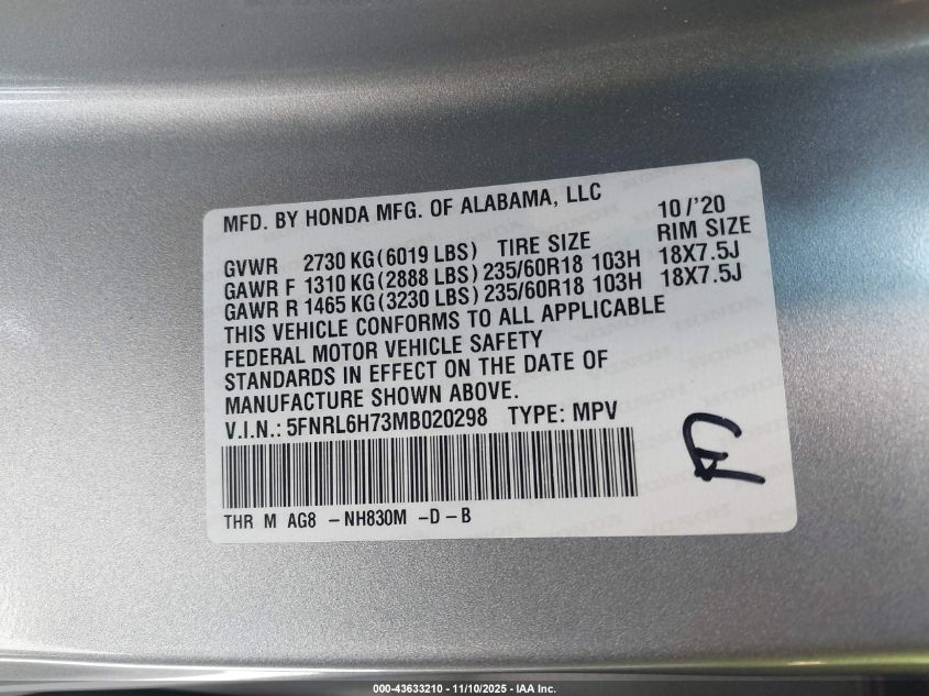 2021 HONDA ODYSSEY - 5FNRL6H73MB020298, колір - Срібний, 3.5, Бензин, Передній привід із США