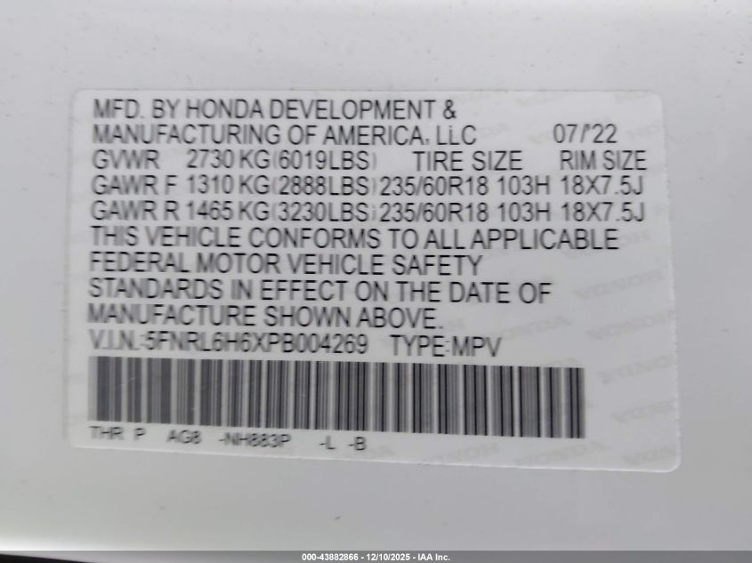 2023 HONDA ODYSSEY - 5FNRL6H6XPB004269, колір - Білий, 3.5, Бензин, Передній привід із США