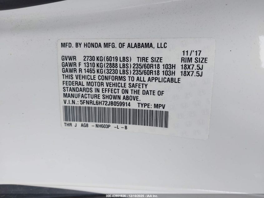 2018 HONDA ODYSSEY - 5FNRL6H72JB059914, колір - Білий, 3.5, Бензин, Передній привід із США