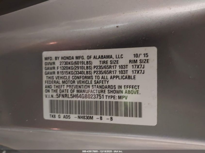 Колір Циліндри 6Привід Передній привідVIN 5FNRL5H64GB023751Стан НевідомоУшкодження Передня або задня